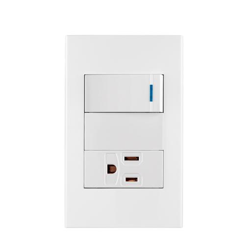 Placa armada interruptor y contacto color blanco línea Española de 1 módulo TR45590